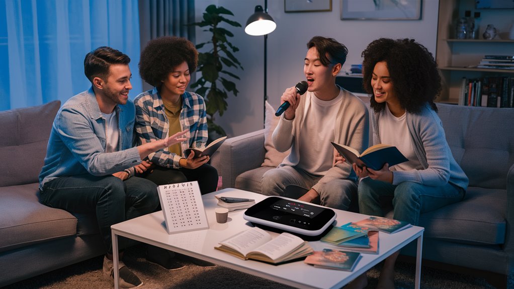Get everyone into the fun with team-based games. Set up Band Battles where teams mix singing, moves, and stage style. Play Music Guessing Games and Music Truth or Dare for good laughs and to get everyone talking. These group games make sure the fun keeps going and help shy singers join in more.